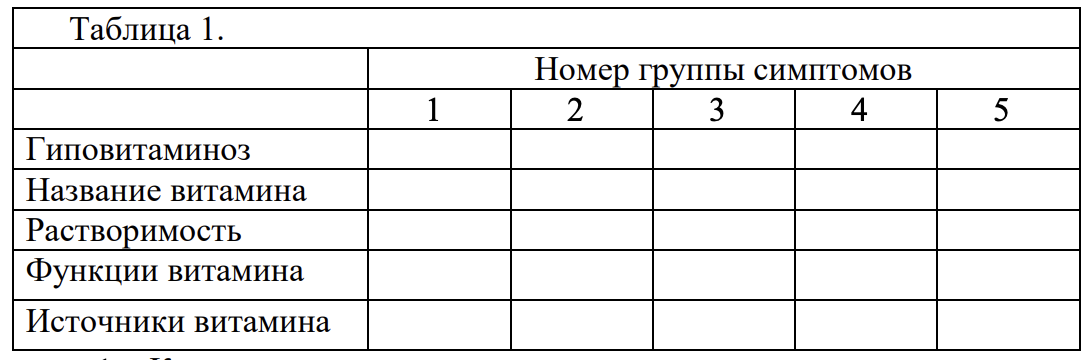 В мировой истории существовал период, когда люди считали, что для нормальной жизнедеятельности организма человека и животных вполне достаточно поступления белков, жиров, углеводов, минеральных веществ и воды. Практика и опыт показали, что для нормальных роста и развития одних этих веществ недостаточно. История сухопутных и морских путешествий, наблюдения врачей выявили существование особых болезней, развитие которых непосредственно связано с неполноценным питанием, хотя оно включало все необходимые питательные вещества, известные к тому времени. Некоторые болезни, вызванные недостатком в пище каких-либо веществ, носили эпидемический характер. Состояния, связанные с пониженным содержанием в организме конкретных витаминов вследствие ферментных дефектов или же нарушений режима питания, называют гиповитаминозами. Перед вами симптомы некоторых гиповитаминозов. Определите название каждого из них, укажите соответствующие витамины и их характеристики. Заполните таблицу 1.