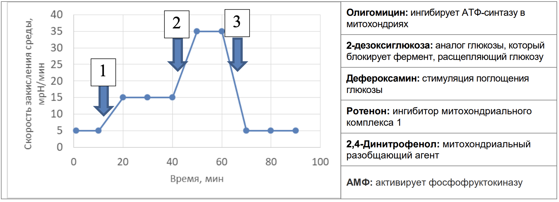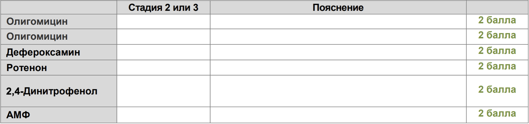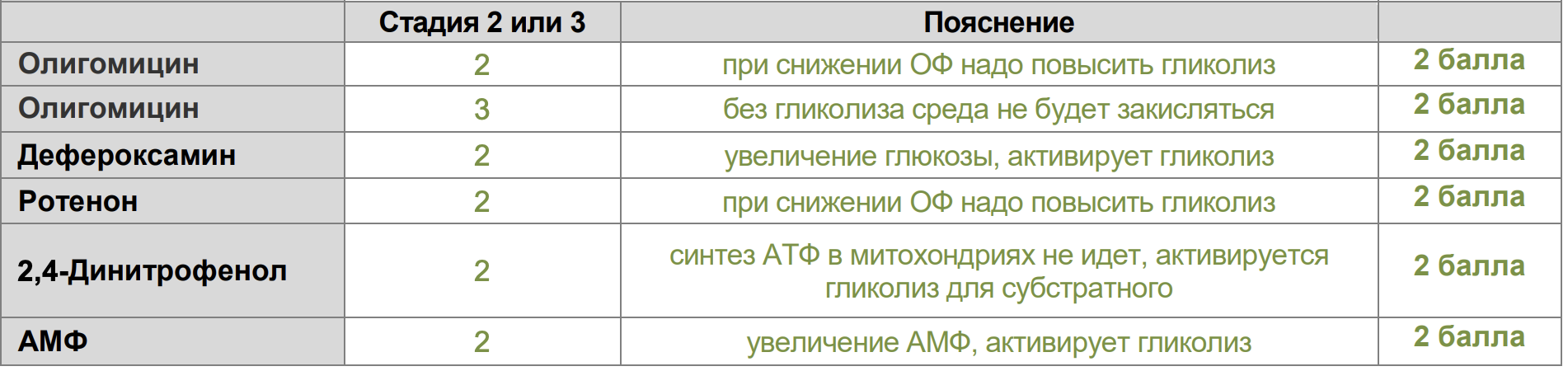 Задание 4. Исследователи изучали прохождение процессов Б и В в клетках. Оказалось, что многие клетки способны переходить с одного типа получения энергии на другой для наиболее эффективной адаптации. Исследователи добавляли различные вещества к культуре клеток и снимали показатели скорости закисления среды. Активность какого процесса отражает закисление среды? (ответ поясните) Подумайте, добавление каких веществ могло привести к переходу клеток в состояния, отмеченные на диаграмме стрелками 2 и 3, если в точке 1 была добавлена глюкоза. В таблице укажите 2 или 3 и поясните ответ.