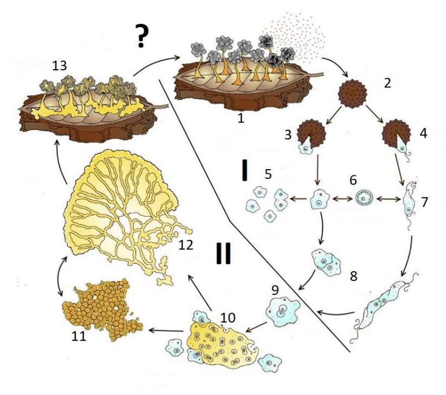 3. Рассмотрите схему жизненного цикла слизевика. Какой процесс обозначен вопросительным знаком?