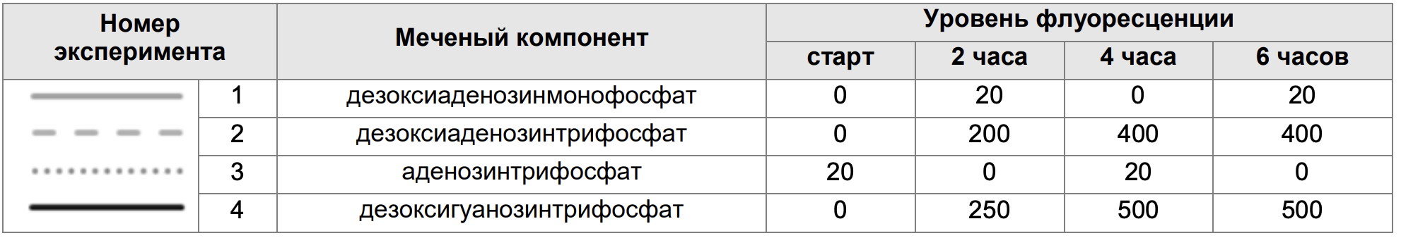 Для изучения процесса репликации ученые использовали систему in vitro (присутствовали все необходимые белковые компоненты для репликации и смесь нуклеотидов) с добавлением флуоресцентно меченных компонентов. В пробирку добавляли одноцепочечную ДНК-матрицу и затравку. Через определенные промежутки времени часть реакции останавливалась, невключившиеся нуклеотиды отмывались. Затем измеряли уровень флуоресценции, который зависит прямо пропорционально от количества включившегося нуклеотида. Результаты приведены в таблице.