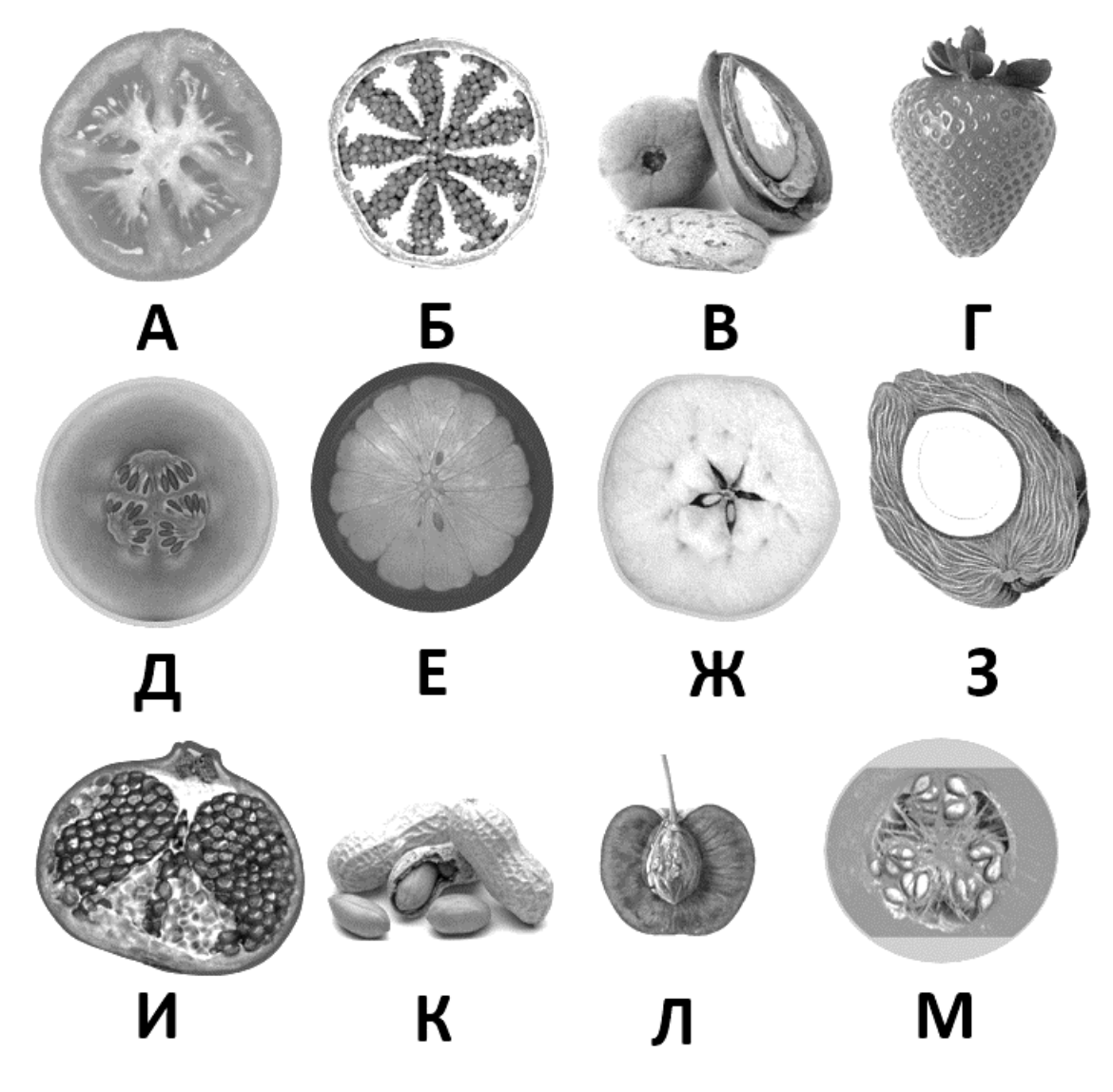 Карпология – «вкусная» наука, изучающая строение, многообразие и распространение плодов. Ниже представлены плоды известных растений. Соотнесите плод (А-М) с соответствующим видовым/родовым названием растения (1–12). Для каждого плода напишите его правильное ботаническое название.