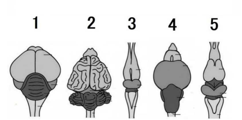 Задание 3. Помимо уже перечисленных выше адаптаций, для птиц характерно и особое строение головного мозга. Изучив рисунки ниже, выберите вариант, на котором изображён головной мозг канарейки. Объясните, какая часть мозга и по какой причине будет одинаково хорошо развита как у птиц, так и у рыб, но, при этом, будет развита существенно хуже у земноводных и рептилий?