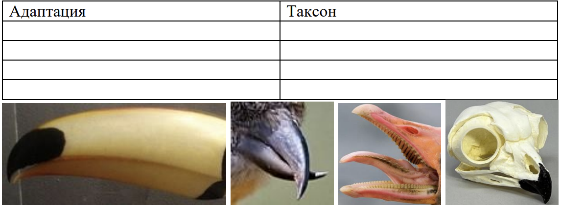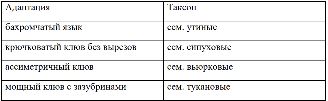 Задание 6. В данном задании мы предлагаем вам провести параллели между морфологическими адаптациями птиц их высшим таксоном.