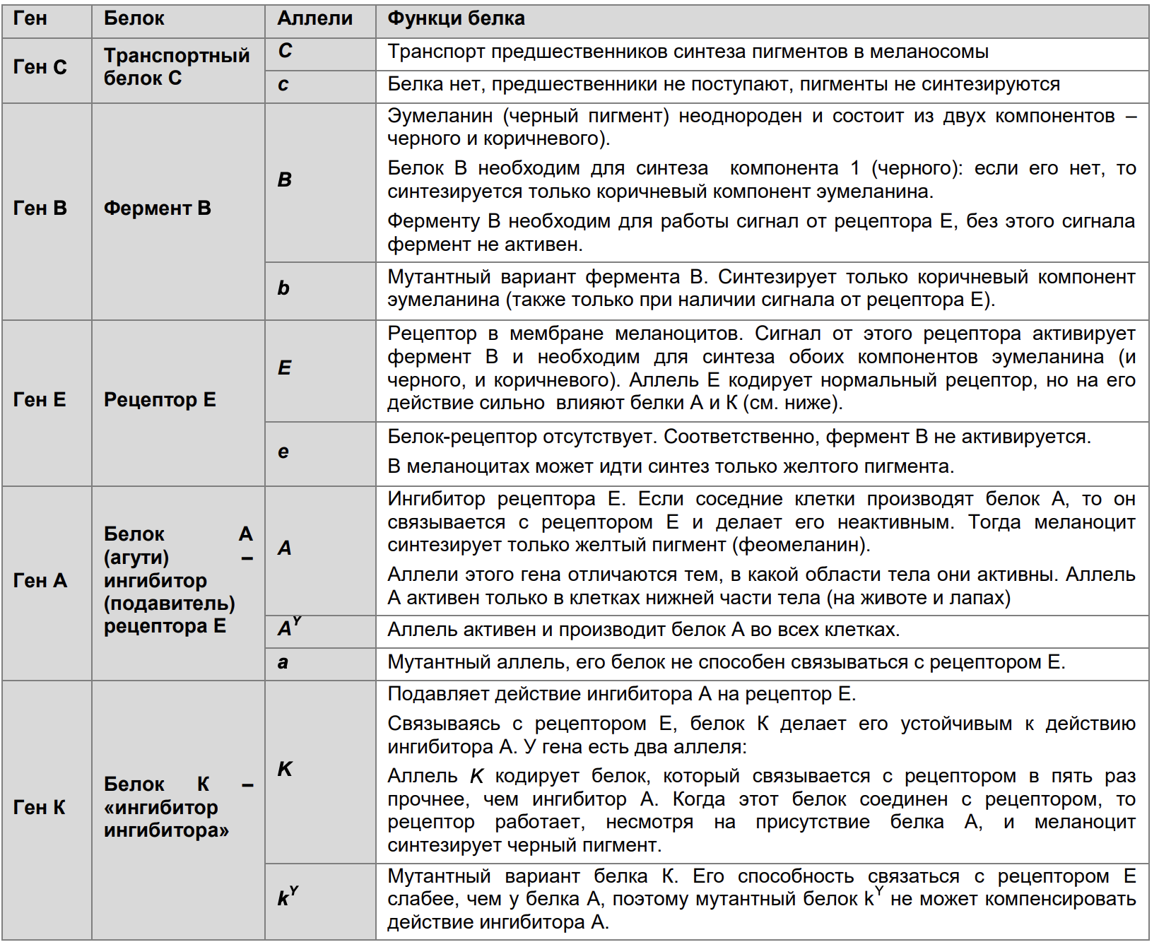 Как у всех млекопитающих, окрас собак определяется сочетанием двух основных пигментов – черного и желтого. Они называются меланины (черный – эумеланин, а желтый (рыжий) – феомеланин). Синтез пигментов идет в специализированных клетках – меланоцитах, причем не в цитоплазме, а специализированных органеллах – меланосомах. Для синтеза нужны ферменты, транспортные белки и мембранные рецепторы сигналов. За каждым из таких белков стоит свой ген. Мы здесь рассмотрим механизм действия и аллели только пяти из них, играющих ключевую роль в формировании окраса: гены C, B, E, A и K.