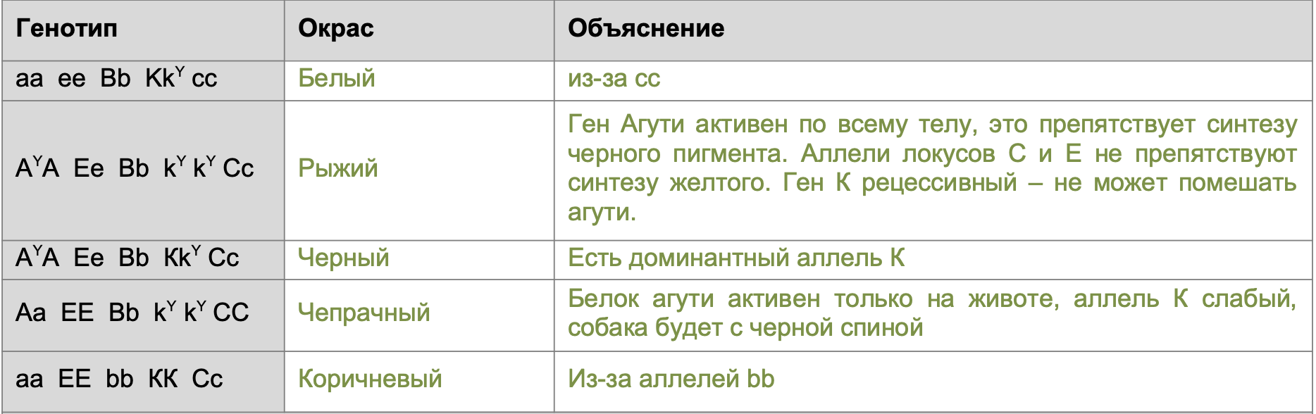Задание 4. Предположите окрас собак, имеющих перечисленные генотипы, объясните свой выбор: