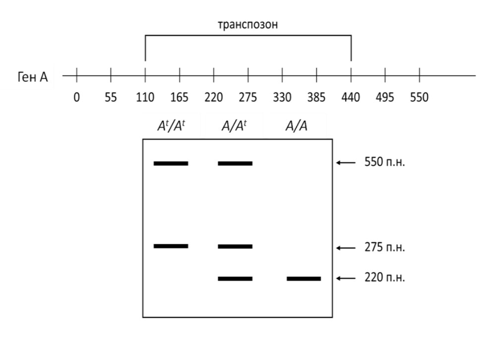 Для гена А известны и другие аллели, в частности аллель At. Возникновение аллеля At вызвано инсерцией транспозона в один из экзонов гена А. Ниже приведен фрагмент гена с этой инсерцией и электрофореграмма продуктов ПЦР, полученных с помощью праймеров, созданных для идентификации аллеля A t. Наверху электрофореграммы указаны определенные по ней генотипы собак.
