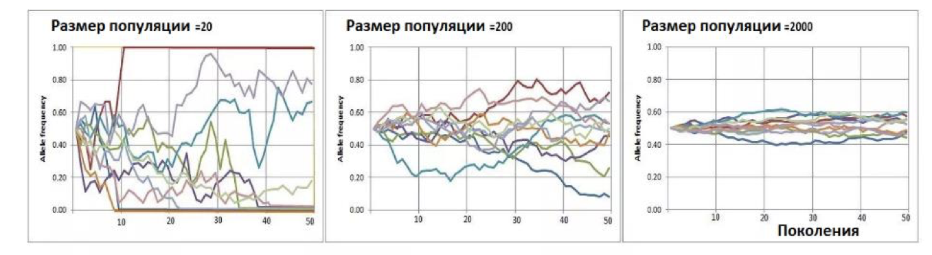 При переходе от одного поколения к следующему происходит случайное изменение частот аллелей, называемое дрейфом генов. На рисунке снизу показаны по десять компьютерных симуляций дрейфа генов, представленных двумя аллелями, в популяциях разного размера (по оси OХ – номер поколения, по оси OY – частота аллеля). Рассмотрите рисунок и выберите все верные утверждения.