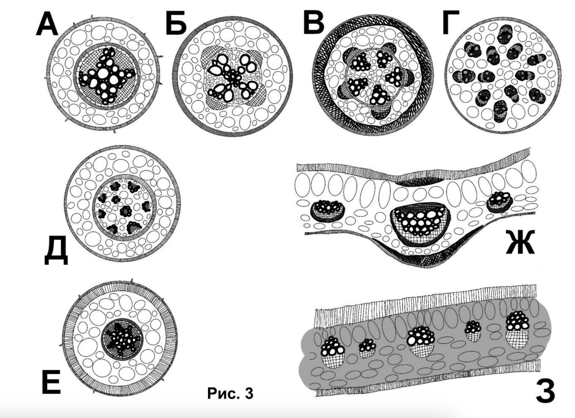 Высшие растения имеют дифференцированные ткани и органы, и по расположению тканей на срезе можно определить как орган, так и систематическое положение исследуемого растения в рамках крупных таксонов. Перед вами схематичные изображения двух растений (рис. 1 и 2) и их поперечных срезов (рис. 3), выполненных в местах, обозначенных арабскими цифрами на рисунках.