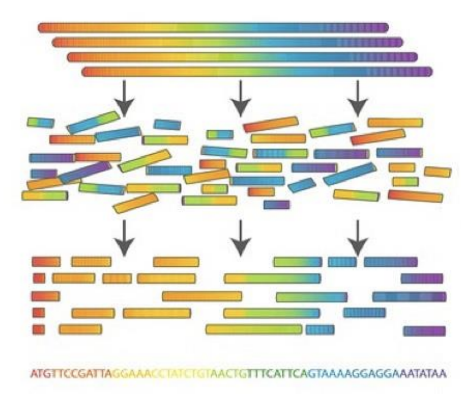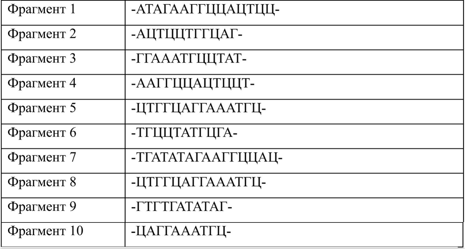 Восстановите последовательность участка ДНК – W по имеющимся фрагментам после секвенирования этого участка методом дробовика (ДНК случайным образом разбивают на небольшие фрагменты, определяют их нуклеотидный состав, а затем восстанавливают исходный участок на основании перекрывающихся последовательностей).