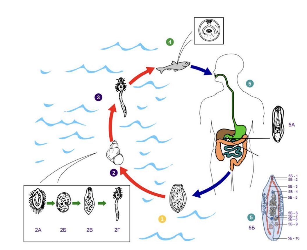 1. Яйцо; 2А. Мирацидий; 2Б. Спороциста; 2В. Редия; 2Г. Церкария; 3. Свободноплавающая церкария; 4. Метацеркария; 5А. Декапсуляция; 5Б. Взрослая особь.