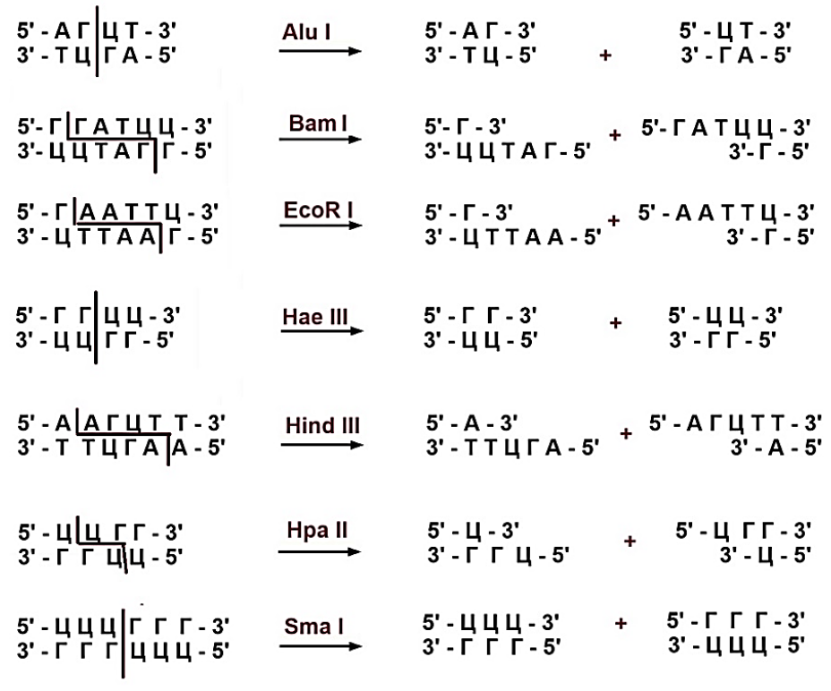Экспериментатору необходимо получить фрагменты ДНК для клонирования. В его лаборатории есть ферменты рестрикции, представленные на рисунке.