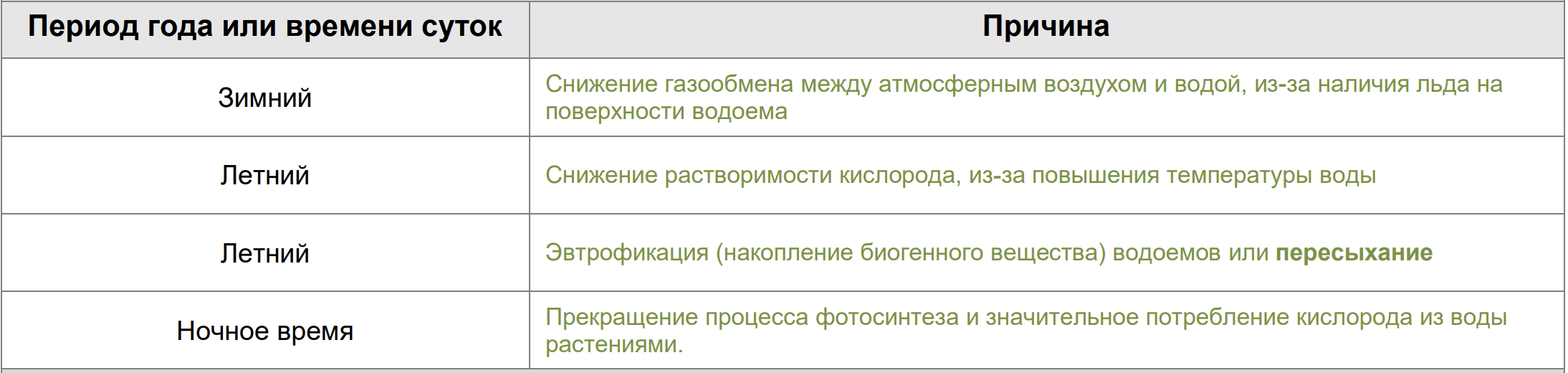 Вопрос 1. Назовите возможные причины снижения уровня кислорода в воде (в естественных водоемах), заполните таблицу.