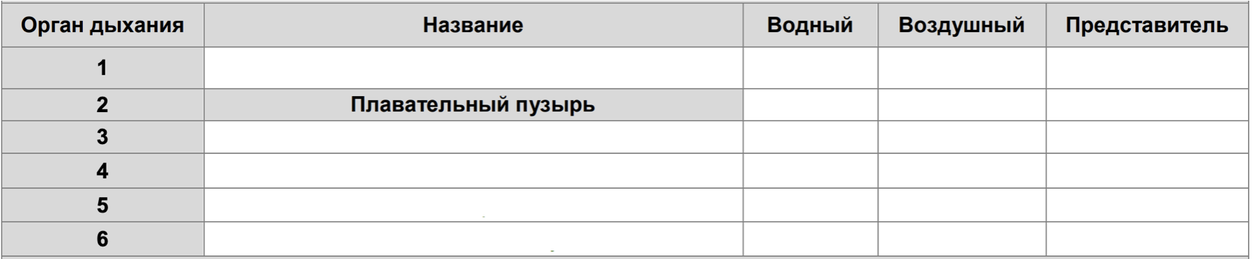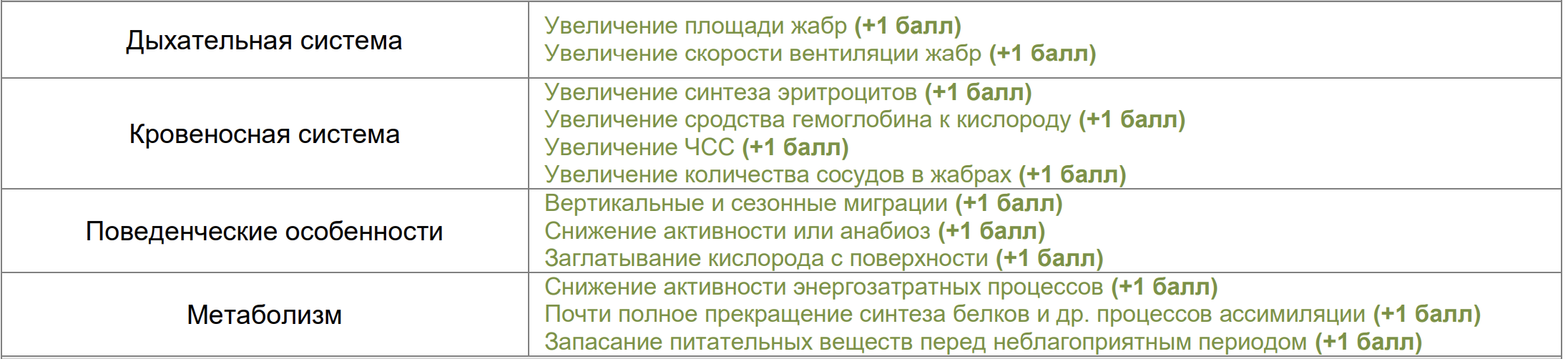 Вопрос 2. Используя подсказки в таблице, опишите, какие механизмы и различные особенности строения или физиологии могут использовать рыбы для того, чтобы пережить неблагоприятный период недостатка кислорода в воде.