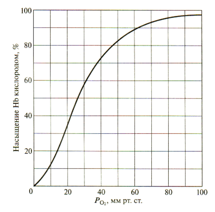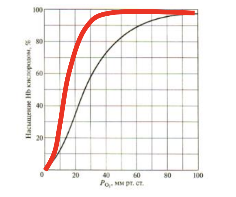 Вопрос 4. Одним из видов приспособления к низкому содержанию кислорода может быть повышение сродства гемоглобина к кислороду. На графике приведена кривая диссоциации оксигемоглобина. Нарисуйте, как будет выглядеть эта кривая для гемоглобина с повышенным сродством к кислороду. Ответ поясните.