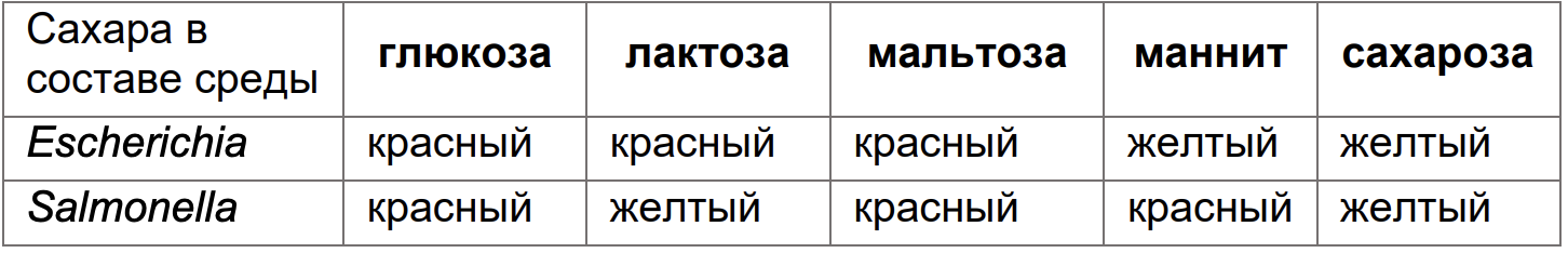 Вопрос 4. Многие бактерии при утилизации различных сахаров в процессе жизнедеятельности изменяют кислотность окружающей среды. Назовите процесс, в результате которого это происходит? В какую сторону изменяется рН? Метаболическая активность бактерий часто используют для их идентификации. В таблице ниже представлен результат биохимического теста для бактерий Escherichia coli и Salmonella enterica (цвет среды, на которой выращивались бактерии, после добавления индикатора). Использовался индикатор нейтральный красный, изменяющий свой цвет от красного при рН=6.8 до янтарно-желтого при рН=8.4.