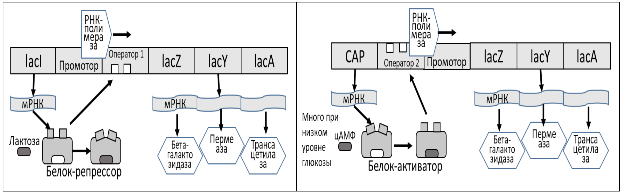 Вопрос 5. Для получения окраски в чашке Петри можно добавлять в питательную среду хромофор (это молекула, которая поглощает свет с определенной длиной волны и в результате излучает цвет). Обычно это индолилхромофоры, которые присоединены к какому-либо углеводу с помощью бета-гликозидной связи. В случае, если такой субстрат проникает в бактерию, происходит его расщепление с помощью фермента бета-галактозидазы, выделяется бесцветный индолол. В присутствии кислорода он димеризуется с образованием пигмента индиго (или его модификаций). На рисунках ниже приведены схемы регуляции работы лактозного оперона некоторой бактерии. Этот оперон содержит ген бета-галактозидазы, а также ген пермеазы, отвечающей за транспорт бетагалактозидов в клетку. Ориентируясь на эти схемы, предложите несколько вариантов бактериографии, включающих в себя регуляцию работы лактозного оперона (в разные участки чашки Петри можно добавлять различные вещества). (14 баллов)