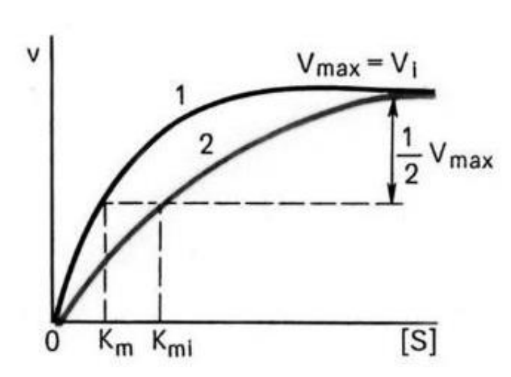 Конкурентное ингибирование, связывается с ферментом вместо субстрата, при увеличении концентрации субстрата, он вытесняет ингибитор (3 балл)