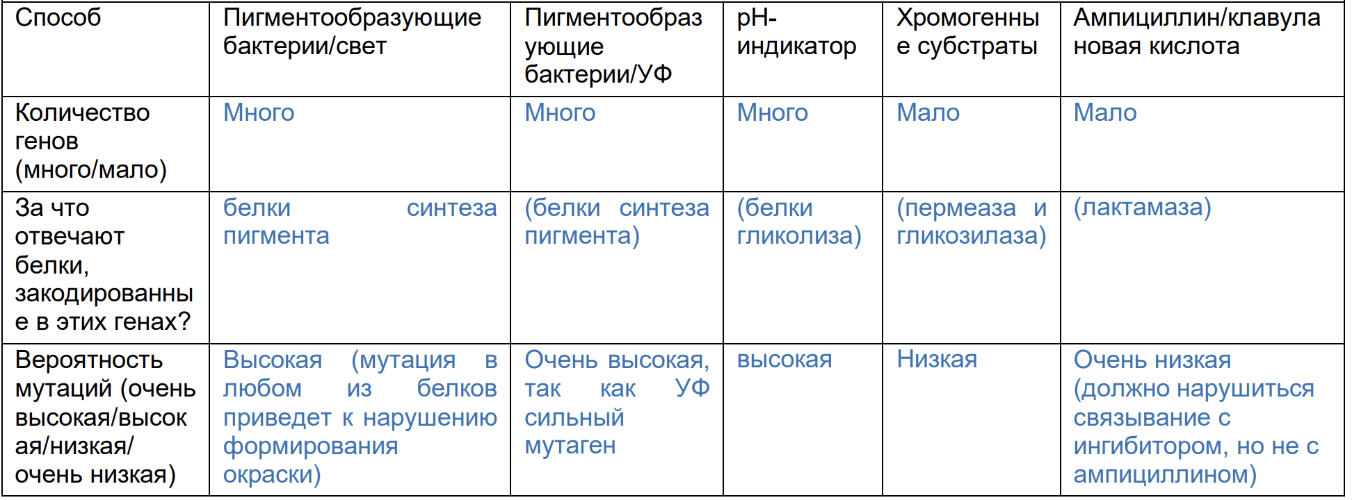 Вопрос 7. К сожалению, у бактерий достаточно часто случаются мутации, которые могут нарушить нашу бактериографию. Оцените, при каком из способов, которые мы рассматривали выше, художник с большей вероятностью столкнется с неудачной мутацией (предполагаем, что чем больше генов, кодирующих белки-участники, тем вероятнее будет происходить мутация, которая нарушит один из них)? (10 баллов)