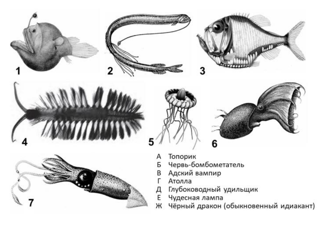 Вопрос 4. На рисунке представлены изображения некоторых представителей глубоководной фауны. Сопоставьте изображения животных с их названиями, а также укажите тип и класс, к которым принадлежат данные организмы.