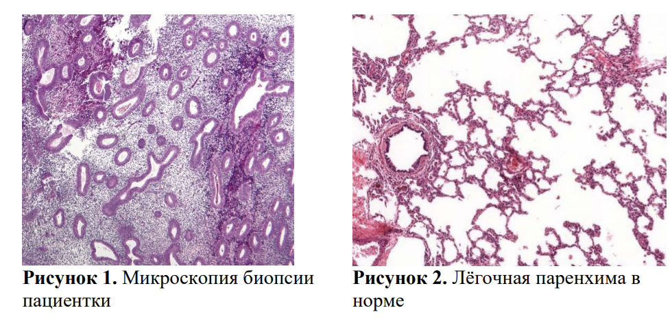 Микроскопия (греч. micros — мелкий, маленький и skopeo — вижу) — изучение объектов с использованием микроскопа. Микроскопы для медицинских исследований предназначены, прежде всего, для оценки мельчайших структур на уровне клетки и ткани. С такой информацией специалист окажет правильную помощь с наименьшими рисками для здоровья пациента. Частным случаем использования микроскопии в диагностике заболеваний является микроскопия кусочков опухолевого материала. Пациентка Е., 27 лет, поступила в отделение торакальной хирургии с жалобами на кровохарканье до 10 мл в сутки, боль и жжение в грудной клетке, общую слабость. Больной себя считает в течение последних 3 месяцев, когда стали беспокоить вышеперечисленные жалобы. Также пациентка сообщает, что заметила цикличность во времени появления кровохарканья - каждый месяц в течение 3-4 дней. Первый эпизод был 17 мая, второй – 18 июня, третий – 18 июля. Менструальный цикл 30 дней. Кровохарканье начиналось на второй или третий дни от начала цикла. На компьютерной томограмме выявлены участки инфильтрации в нижней доле правого лёгкого. При бронхоскопии: на шпоре S6 правого бронха обнаружено красное пятно овальной формы, размером до 4 мм, покрытое кровяным сгустком, в норме в бронхе не наблюдаемое. При биопсии образования бронха обнаружена гистологическая картина, показанная на рисунке 1.