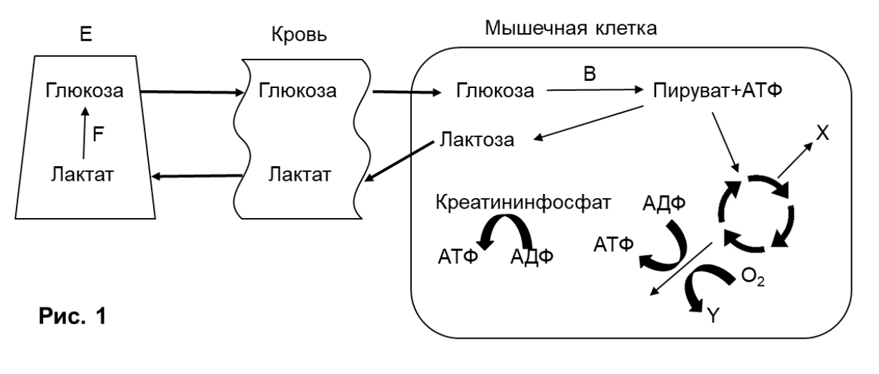 Вопрос 1. Определите название процессов/веществ. Глюкоза поступает в мышцы из крови или при расщеплении вещества А, накопленного в мышцах. Далее она окисляется до пирувата в процессе B. При недостатке кислорода в тканях дальнейшее окисление пирувата до соединений X и Y не происходит, вместо чего пируват окисляется до молочной кислоты, которая выводится из мышцы и транспортируется в орган C, где в клетках D происходит процесс синтеза глюкозы — E, которая в дальнейшем транспортируется обратно к мышце. Такой процесс называется циклом Кори или глюкозо-лактатным циклом. Предположите, из каких веществ Z, кроме лактата, может происходить процесс E?