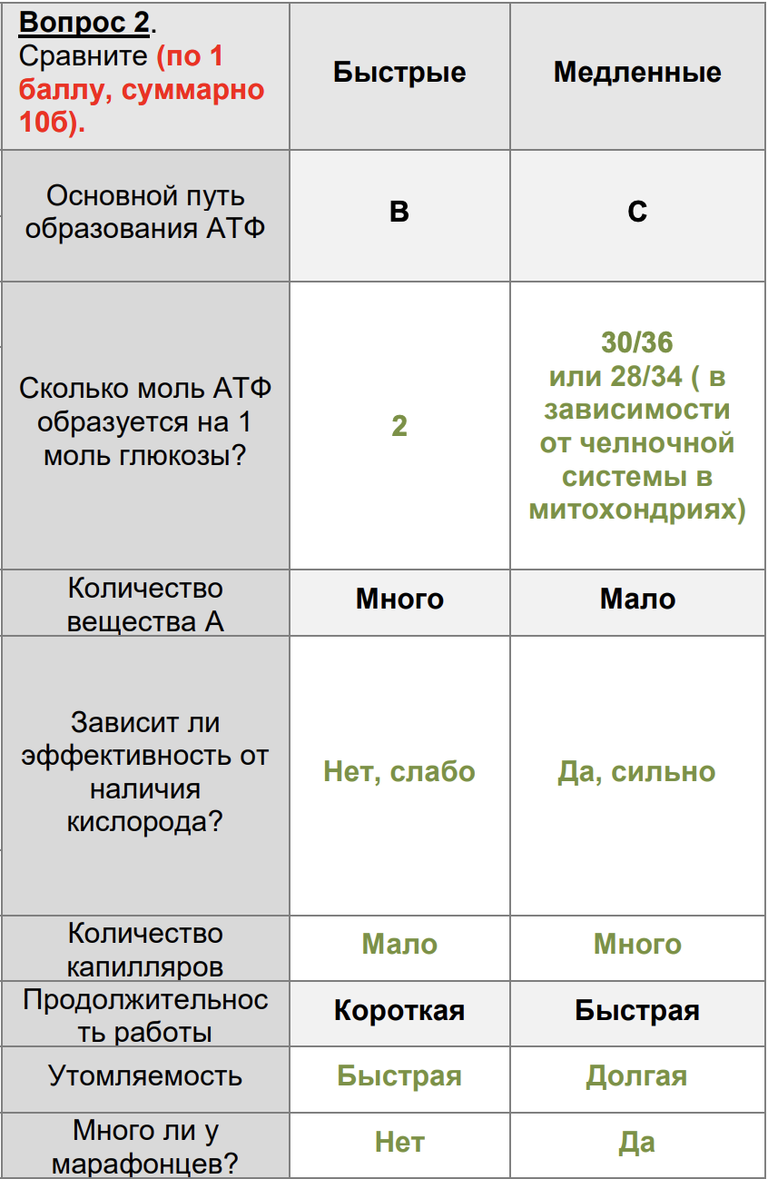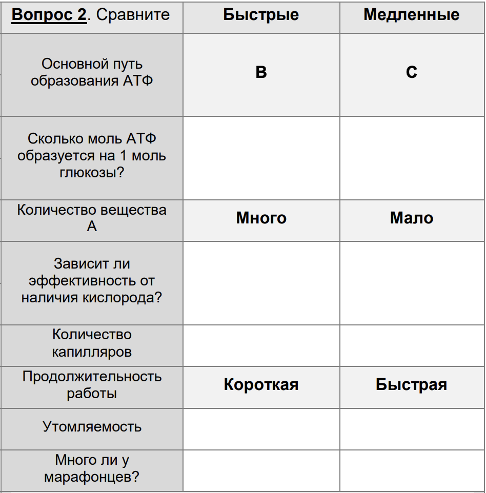 Вопрос 2. Мышцы содержат быстрые и медленные волокна. При беге в первые моменты основная нагрузка идет на быстрые волокна, так как в них есть запас вещества А и ферменты для процесса В, что позволяет получать АТФ быстро. В медленных волокнах присутствует большое количество органелл N, в которых располагаются ферменты для процесса F, а также содержится большое количество белка M, который является одним из переносчиков O2. Получение АТФ здесь идет дольше, но зато эффективнее (с одной молекулы глюкозы или эквивалента получается больше молекул АТФ), поэтому при длительной нагрузке эффективнее использовать медленные волокна. Заполните таблицу с особенностями характерными для быстрых и медленных волокон.