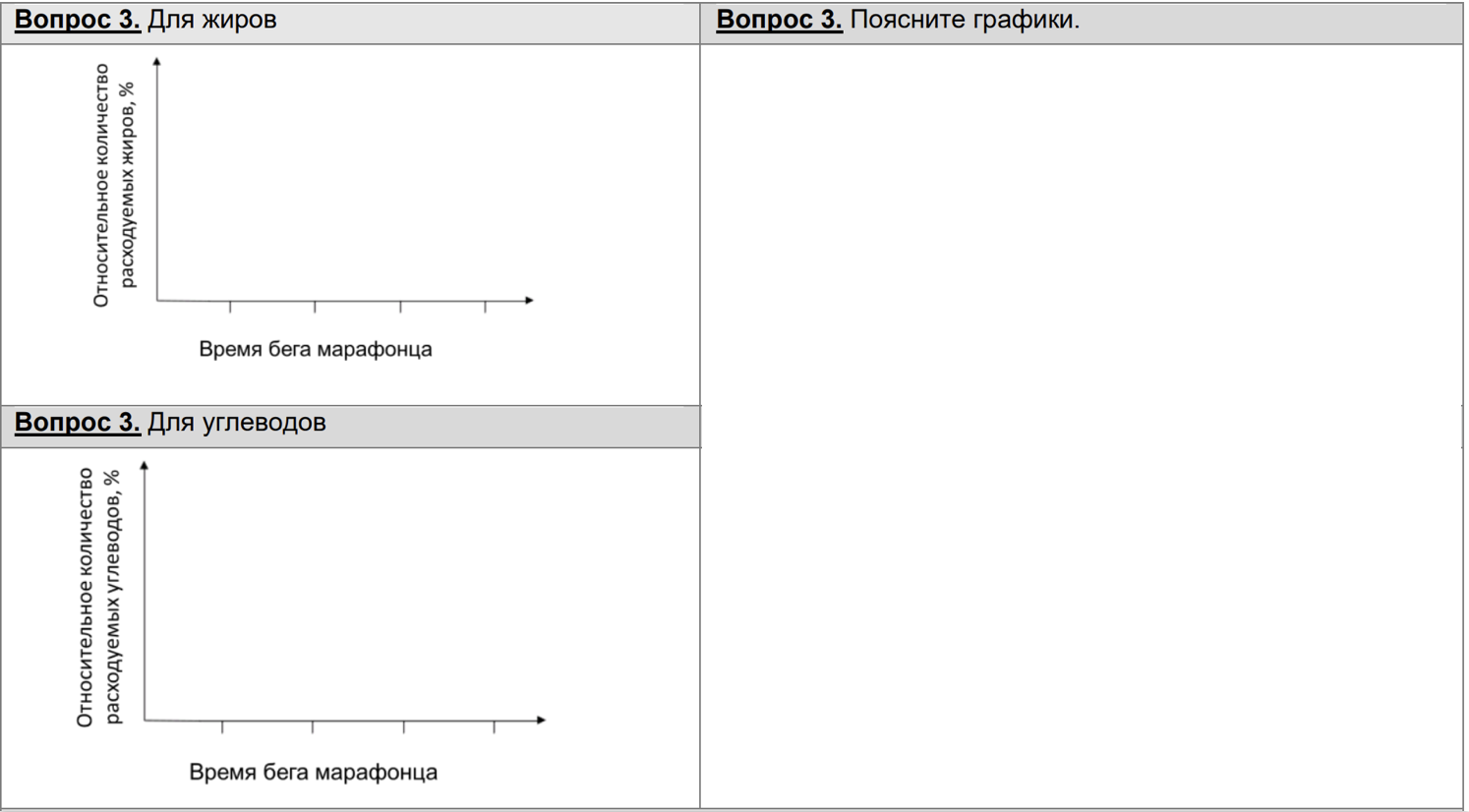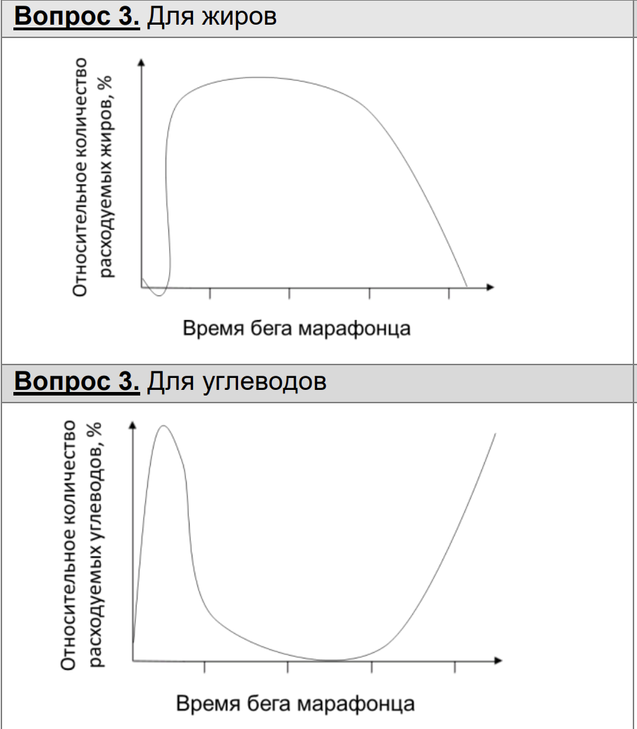 Вопрос 3. Представим марафонца, который знает, что ему предстоит долгий бег, но он никуда не торопится. Экономя силы, он разгоняется и бежит со средней «ненапряженной» скоростью всю оставшуюся дистанцию, но в конце решает сделать финишный рывок. Нарисуйте график расходования жиров и углеводов в его организме, основываясь на том, какие типы мышечных волокон будут преимущественно работать в каждой ситуации. При рассуждении учитывайте, что в процессах F будут в основном использоваться жиры. Графики поясните.