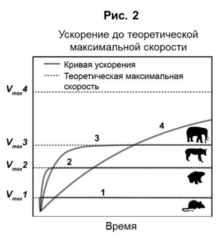 Вопрос 5. Большинство биомеханических моделей предполагают, что теоретическая максимальная скорость животного прямопропорциональна его массе (рис. 2). Однако, реальная максимальная скорость характерна для не самых крупных животных. Проанализируйте график и предположите, почему слон не может достигнуть своей максимальной скорости?