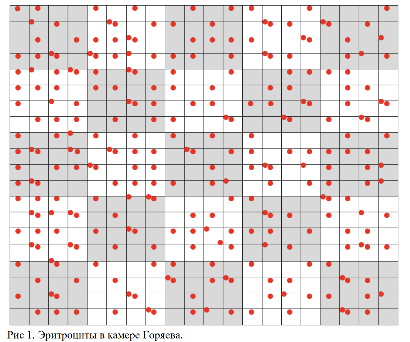 Задание 6. Для подсчёта количества эритроцитов в крови используется камера Горяева. Подсчет проводится в 5 больших квадратах (состоящих из 16 маленьких) по диагонали. Эритроциты, расположенные на левой и верхней границах больших квадратов, подсчитываются для этого квадрата, расположенные на правой и нижней границе – для других. Подсчитайте количество эритроцитов на рисунке.