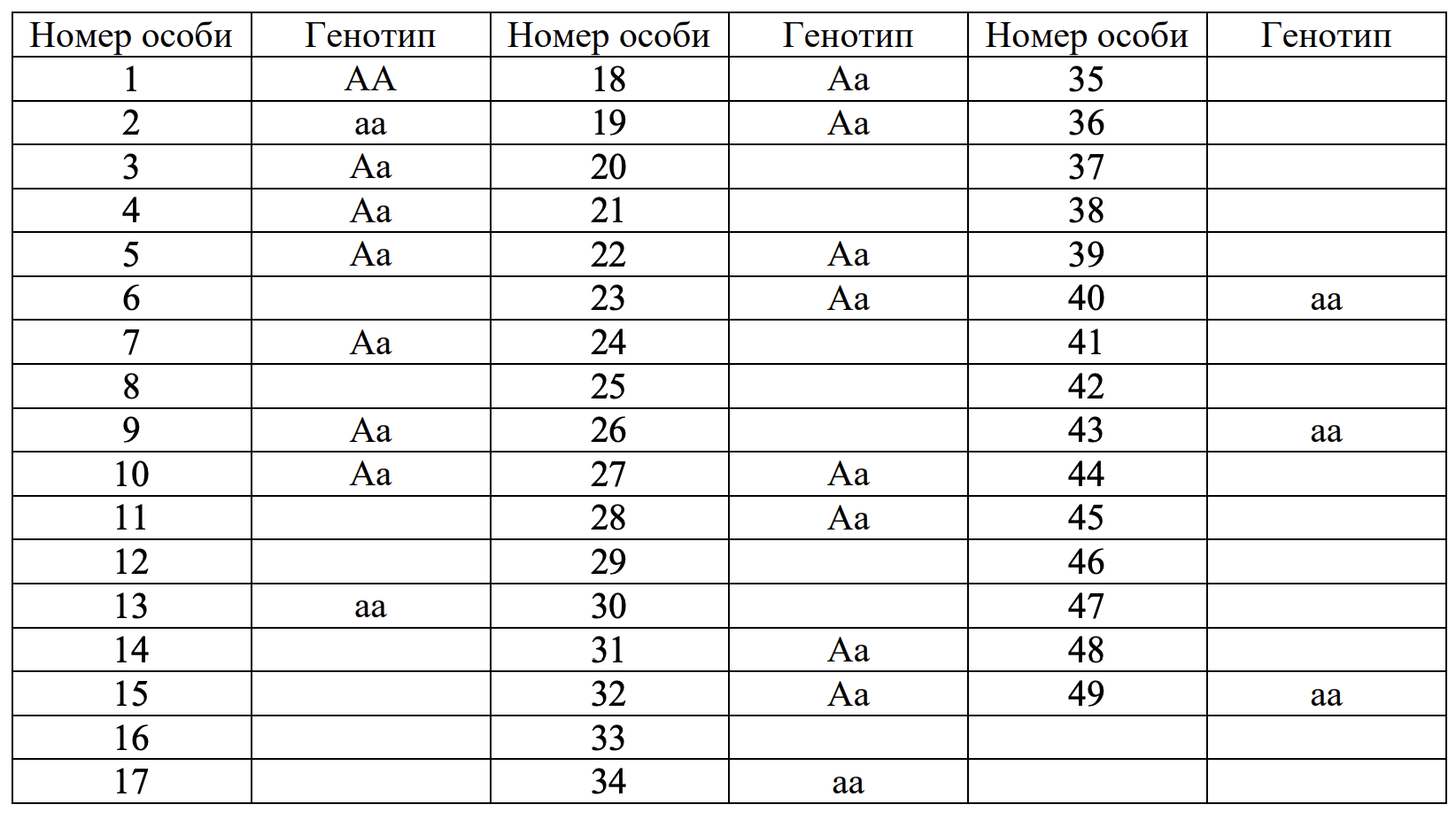 Для определения доли гетерозиготных организмов генетик может использовать закон Харди-Вайнберга. Частота встречаемости рецессивных гомозигот 12,25%. Частота встречаемости рецессивного аллеля 0,35. Частота встречаемости доминантного аллеля 0,65. Доля гетерозигот 45,5% (22,3). Доля доминантных гомозигот 42,25% (20,7). Для выполнения закона Харди-Вайнберга необходимо, чтобы популяция была достаточно большой. В результате ограниченной численности особей в результатах получились нецелые величины. Закон Харди-Вайнберга позволяет оценить частоту встречаемости особей с определенным генотипом, однако данный закон не позволяет определить генотип конкретной особи. Некоторых гетерозиготных особей можно вычислить, используя генеалогическое древо. И используя гибридологический метод для каждой особи, чей генотип не ясен на 100%.