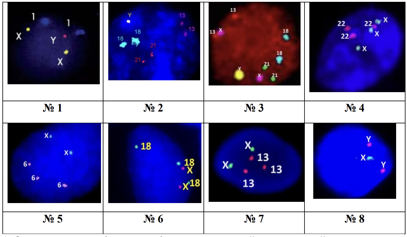 Медико-генетическое консультирование – это отрасль профилактической медицины, главной целью которой является предупреждение рождения детей с наследственной патологией. Фиширование – метод исследования, который позволяет изучить кариотип ребенка, окрасив все хромосомы кариотипа, пару хромосом, часть хромосомы или интересующий нас ген с помощью флуорофоров. Представьте, что вы сотрудник лаборатории по пренатальной диагностике. Проанализируйте иллюстративный материал пациентов 1–8 и решите задания.