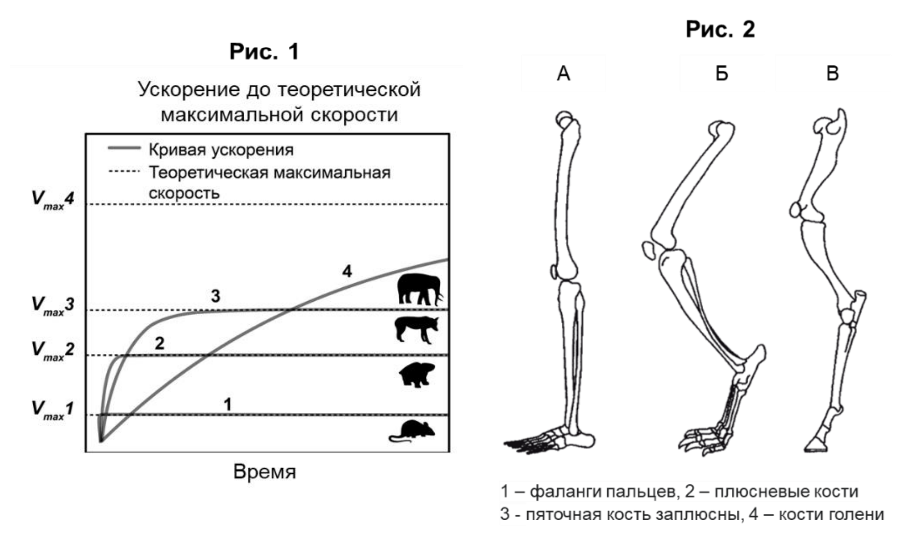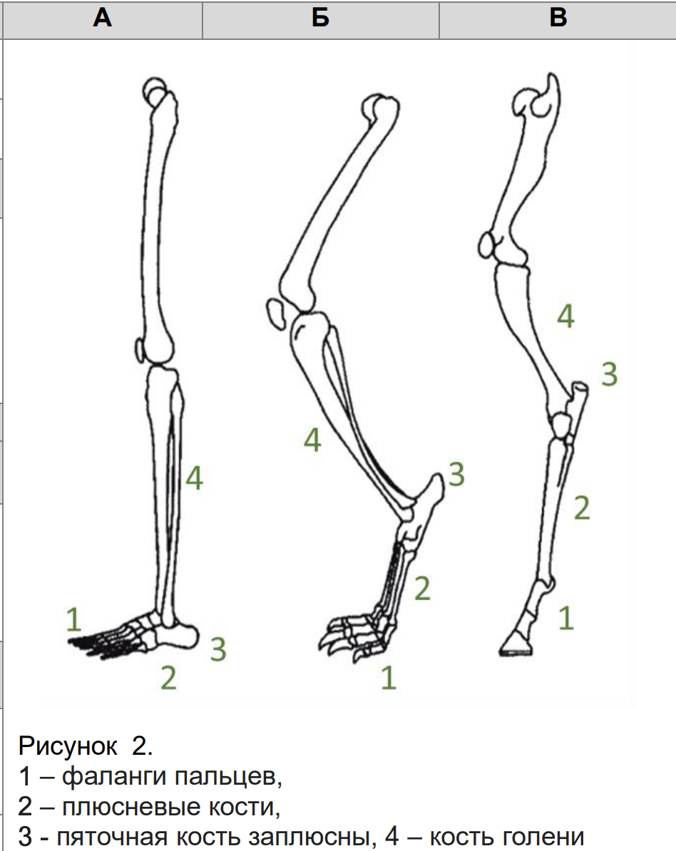 Вопрос 4. Рассмотрите рисунки скелета задней конечности (рис. 2). Предположите, какому типу животных (стопоходящим, пальцеходящим или фалангоходящим) они принадлежат. Отметьте цифрами на рисунке указанные части скелета. Какие особенности конечностей будут ускорять бег по суше? Какой тип конечностей подходит для быстрого бега лучше всего по этим параметрам? (18 баллов)