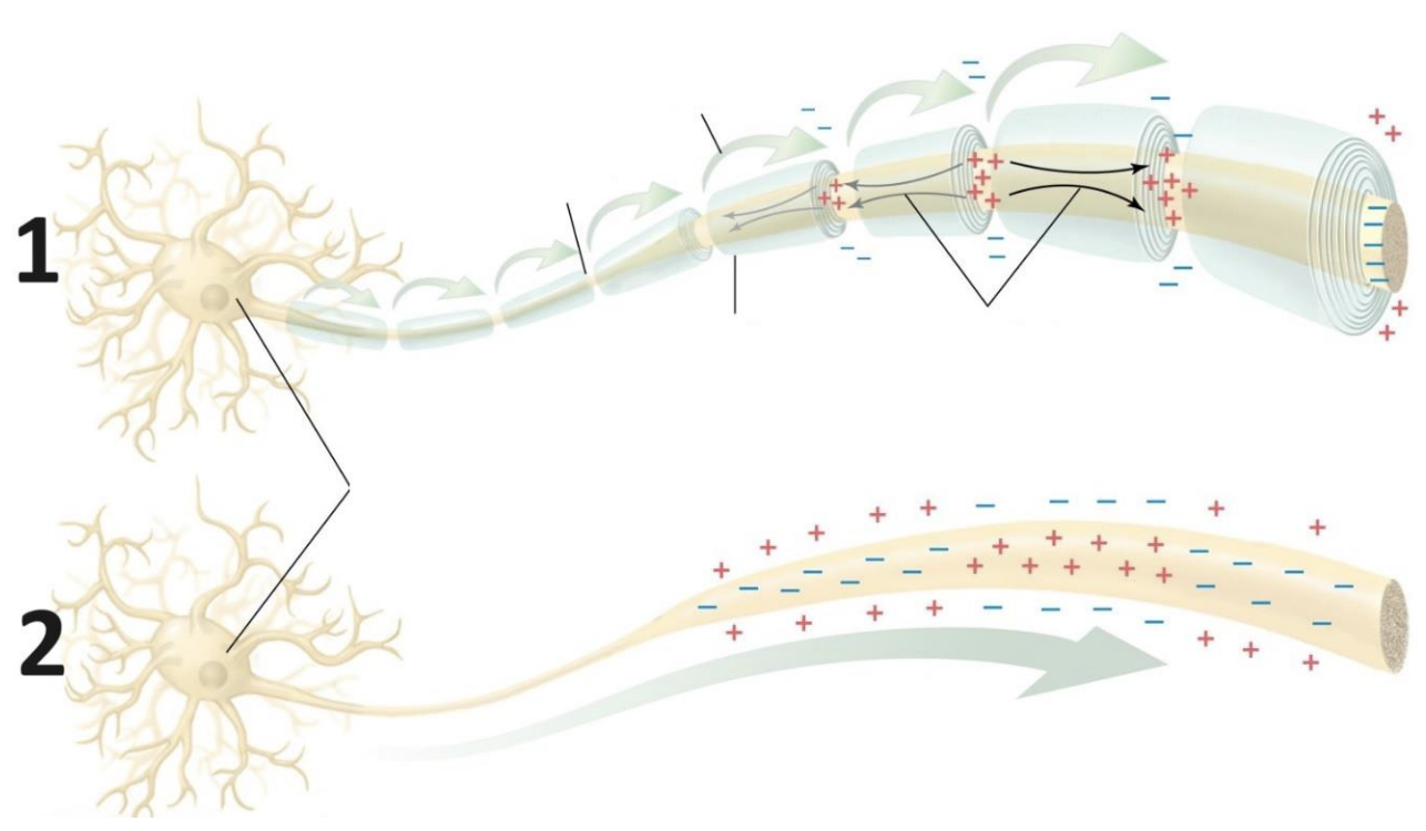 Миелиновые нервные волокна, изображенные на иллюстрации цифрой 1, обладают быстрой скоростью проведения нервного импульса – 5-120 м/с, которая зависит от толщины нервного волокна, а также количества и распределения Na+ каналов в нём. Рассчитайте общее количество Na+ каналов в нервном волокне, которое состоит из: