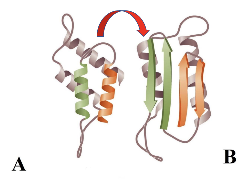 3) При прионных заболеваниях нарушается фолдинг белка PrP. На рисунке представлен процесс изменения вторичной структуры нормального белка, а точнее превращение \alpha-спиралей в \beta-слои, что приводит к формированию патологического варианта белковой молекулы, при неизменной первичной структуре.