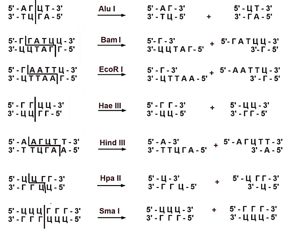 Экспериментатору необходимо получить фрагменты ДНК для клонирования. В его лаборатории есть ферменты рестрикции, представленные на рисунке.