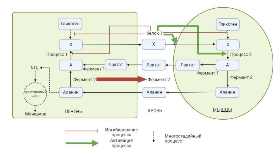 Перед вами изображена схема, изображающая несколько жизненно важных процессов и циклов в организме животных, в том числе и человека. Исходя из указанных на схеме локализаций (мышцы, кровь, печень), а также руководствуясь вашими знаниями по биохимии и физиологии, попробуйте дать ответы на следующие вопросы: азовите молекулы, обозначенные на схеме как «А» и «X».