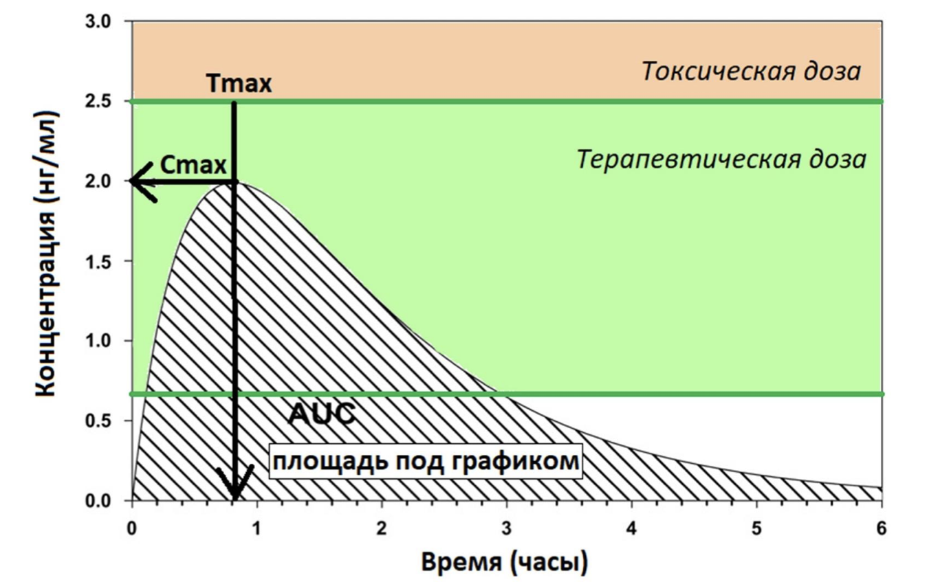 Начинающий фармаколог экспериментальным путем установил фармакокинетическую кривую (зависимость концентрации в плазме крови от времени после приема) нового отечественного препарата – Всерешина.