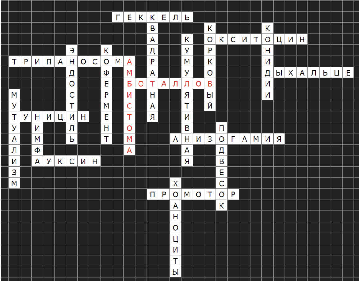 14. Вид целлюлозы в оболочке личиночнохордовых, дающий название данному подтипу. 17. Явление оплодотворения больших женских гамет маленькими мужскими, при этом оба типа гамет имеют жгутики.