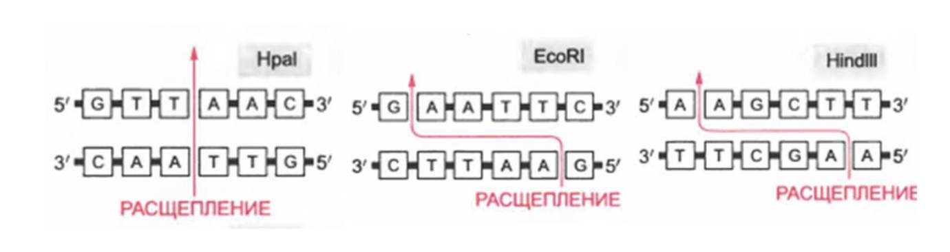 и сайты рестрикции трех рестриктаз: HpaI, EcoRI, HindIII: