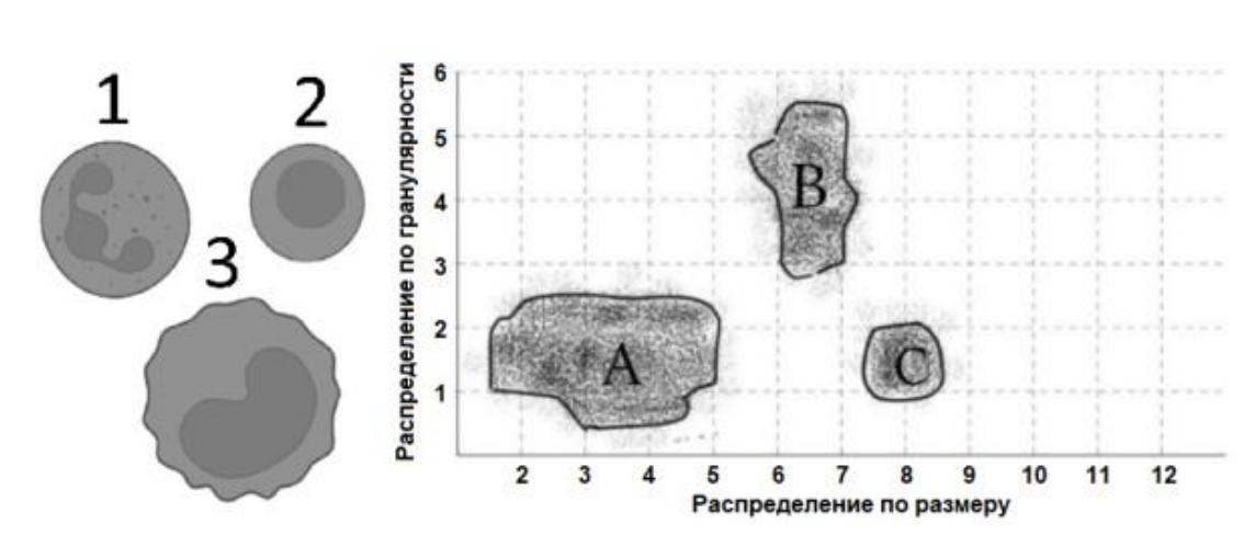 Вопрос 5. Лейкоцитарная формула. Разделяя клетки крови, можно определить лейкоцитарную формулу – соотношение типов лейкоцитов в %. Подсчет происходит по площади, которую занимают группы лейкоцитов. На рисунке изображены лимфоциты, моноциты и нейтрофилы. Сопоставьте название клеток с номером рисунка и местом их скопления на графике, а также впишите лейкоцитарную формулу в медицинскую карту.