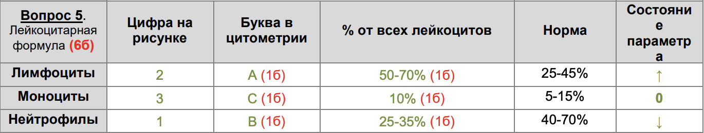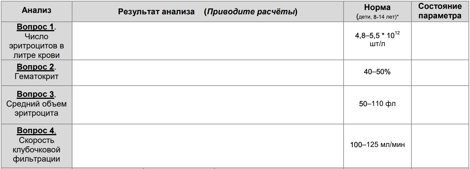 В медицинский центр обратились родители девочки, у которой наблюдались высокая температура, головная боль, слабость и боли в пояснице, отмечается склонность к инфекционным болезням. Оказалось, что у пациентки отмечается склонность к инфекционным болезням, она часто страдает от заболеваний мочеполовой системы. Также ребенок не запоминал цвета. Врач заподозрил системную красную волчанку, однако назначил дополнительные анализы. Вам необходимо посчитать требуемые параметры и внести их в медицинскую карту. Запишите значение в столбик «Результаты анализа», а в графе «Состояние параметра» укажите увеличен (\uparrow), уменьшен (\downarrow), в пределах нормы (0). Обращайте внимание на единицы измерения.