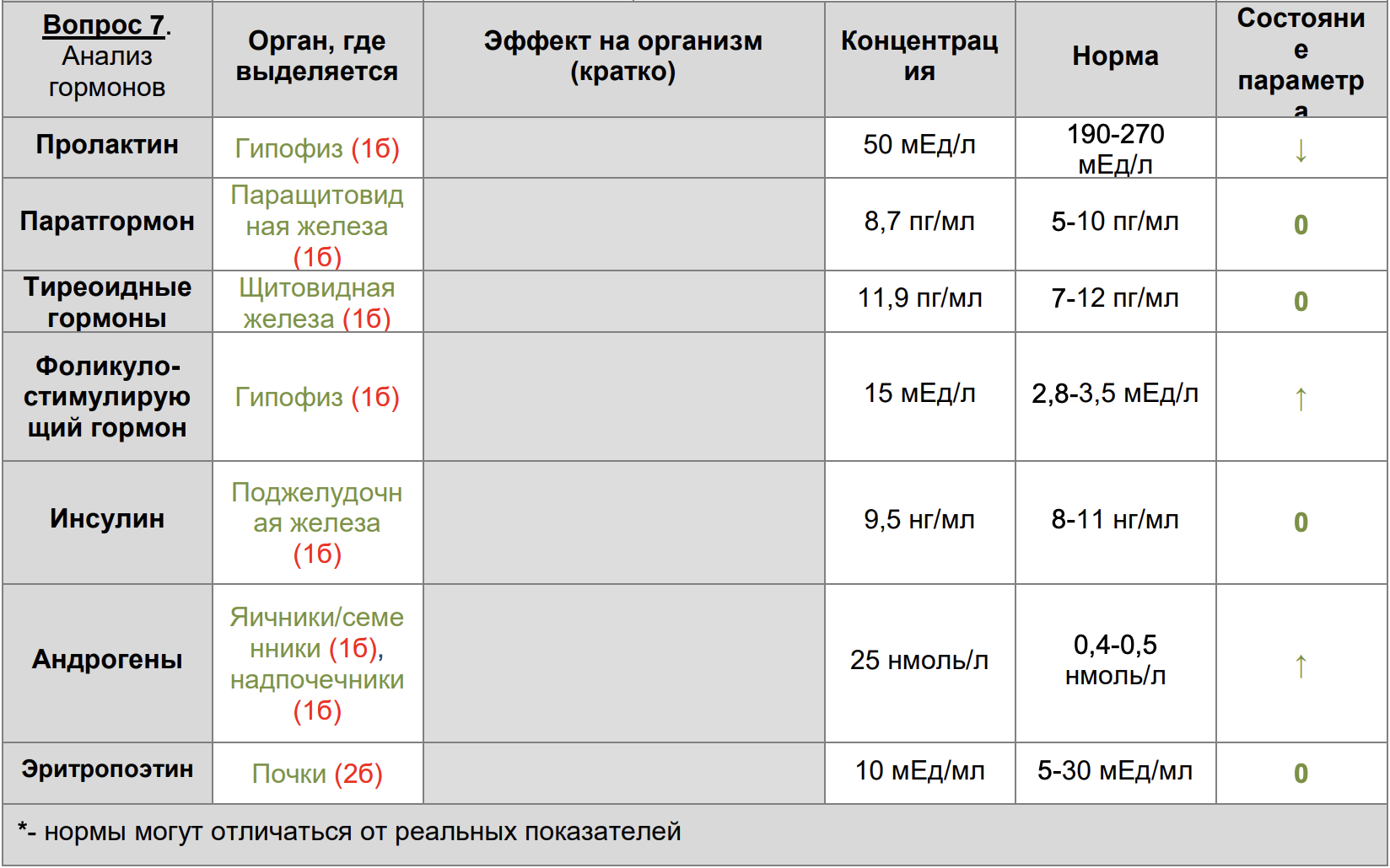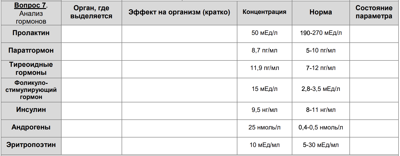 Вопрос 6. Уровень гормонов в крови. В карте указаны названия гормонов и их концентрация в крови. Напротив каждого гормона напишите орган, в котором он выделяется, и сравните показатели с нормой.