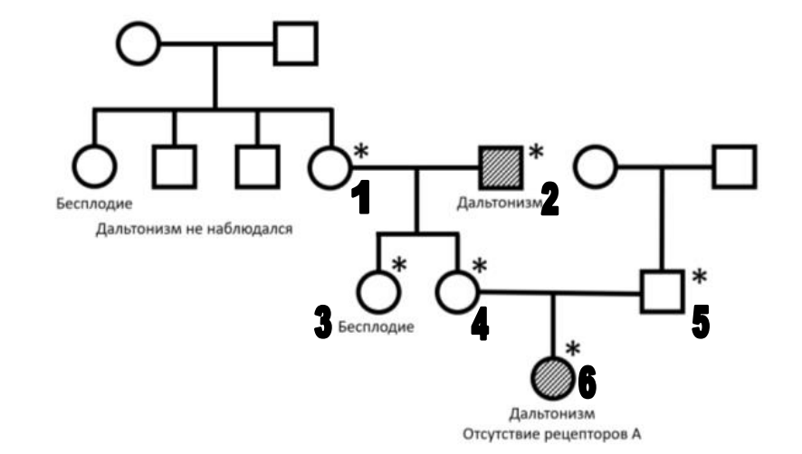 Вопрос 7. Генетический анализ. Врач внимательно расспросил родителей, как давно ребенок не различает цвета и были ли в семье дальтоники. Он составил генеалогическое дерево (дальтонизм (помечен штриховкой) – рецессивное заболевание, сцепленное с полом), после чего попросил сделать тест на наличие рецепторов к андрогенам (рецепторы A). У девочки было диагностировано отсутствие рецепторов А. Известно, что в зависимости от мутации, человек с кариотипом 46,XY и нечувствительностью к андрогенам может иметь мужской (с нарушениями сперматогенеза) или женский фенотип (не имеет яичников). Ген рецепторов А находится на Х-хромосоме на расстоянии 10 сМ от гена дальтонизма. Наличие рецепторов доминирует над их отсутствием. Сестра матери была бесплодной и были другие случаи бесплодия по материнской линии. По отцовской линии ни дальтонизма, ни бесплодия никогда не наблюдалось.