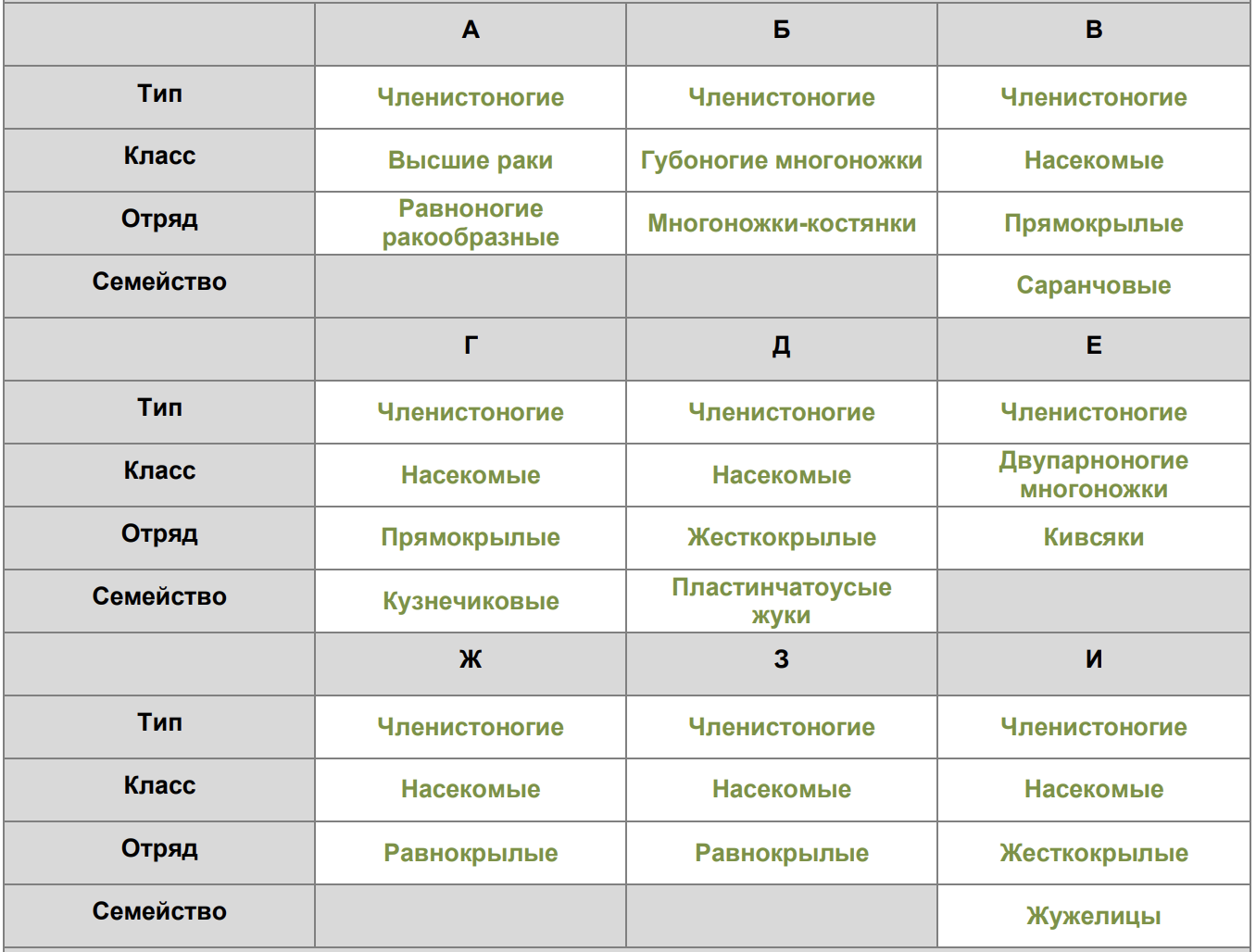 Маленький натуралист Гоша принес домой банку с разными животными, которых он поймал на лугу. Он радостно показал ее родителям и спросил, как называются эти букашки. Мама Гоши помнит, что ученые приписывают любое животное к какому-то типу, классу, отряду и семейству. Папа Гоши знает много терминов, которые могут относиться к пойманным животным, но не уверен, что все они правильные. Давайте поможем родителям справится с нелегкой задачей обучения сына зоологии.