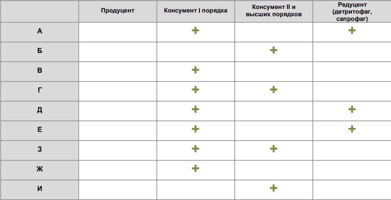Вопрос 3. Гоша в ужасе ищет банки и сачок, собираясь спасать растения рядом с домом. Однако, родители объясняют, что в природных экосистемах каждое животное занимает свое место в пищевых цепях и почти никогда не становится многочисленным «вредителем». Гоша понимает, что хочет рассказать про роли найденных им животных на школьной конференции. Для каждого приведенного живого организма отметьте знаком «+» то положение, которое он может занимать в пищевых цепях (не ставьте лишних отметок). (9 баллов)
