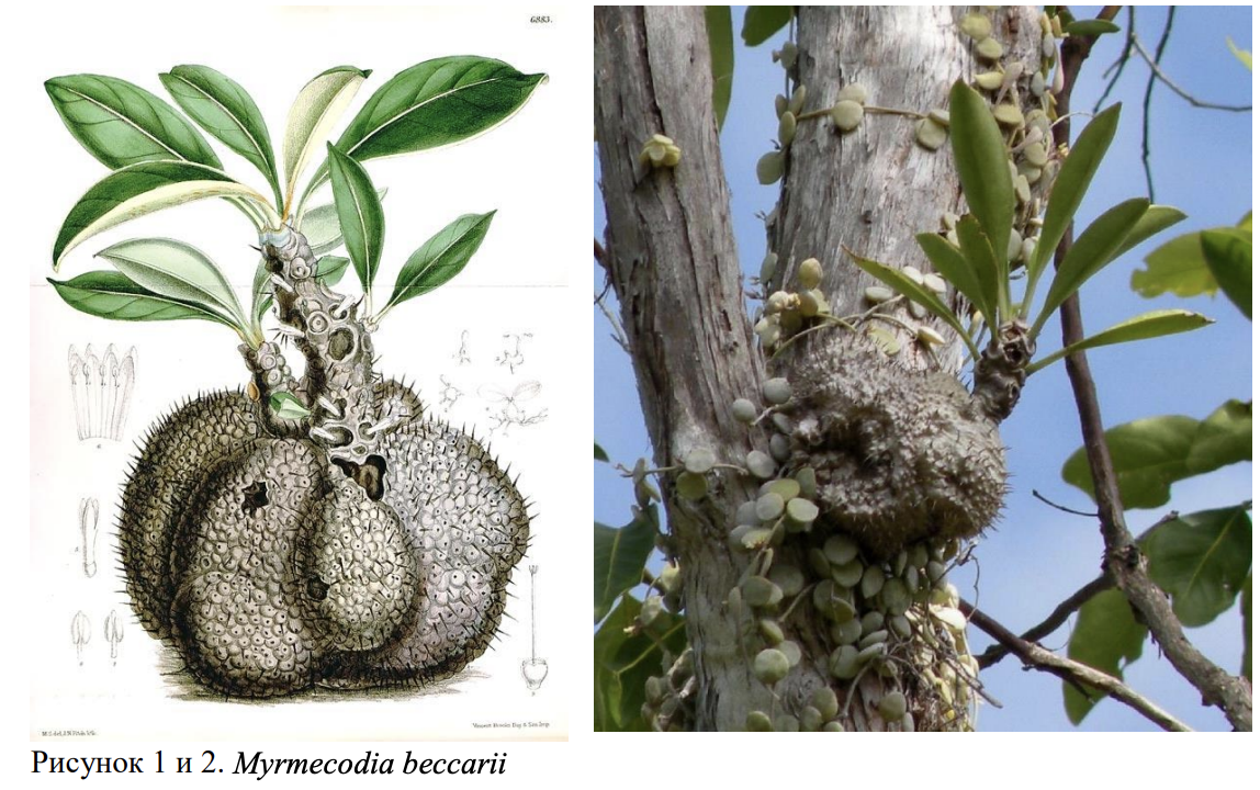 В тропических лесах юго-восточной Азии встречается очень интересная группа растений – мирмекофильные эпифиты. К растениям этой группы относятся гиднофитум муравьиный (Hydnophytum formicarium), мирмекодия клубневая (Myrmecodia tuberosa) и родственные им растения из семейства мареновые (Rubiaceae), особенностью которых является то, что в корнях этого растения живут муравьи рода Philidris.