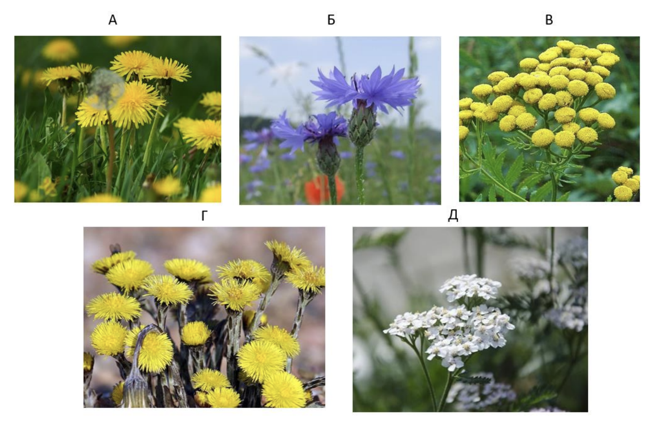 Астровые или сложноцветные (1 балл). А – Одуванчик, Б – Василек (синий), В – пижма, Г – мать-и-мачеха, Д – тысячелистник.
