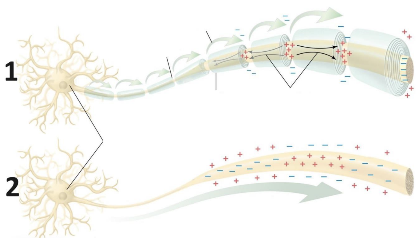- перехватов Ранвье, площадь одного перехвата Ранвье составляет 0,1 мкм2 и Na+ каналов в нём 10 000 на 1 мкм2.