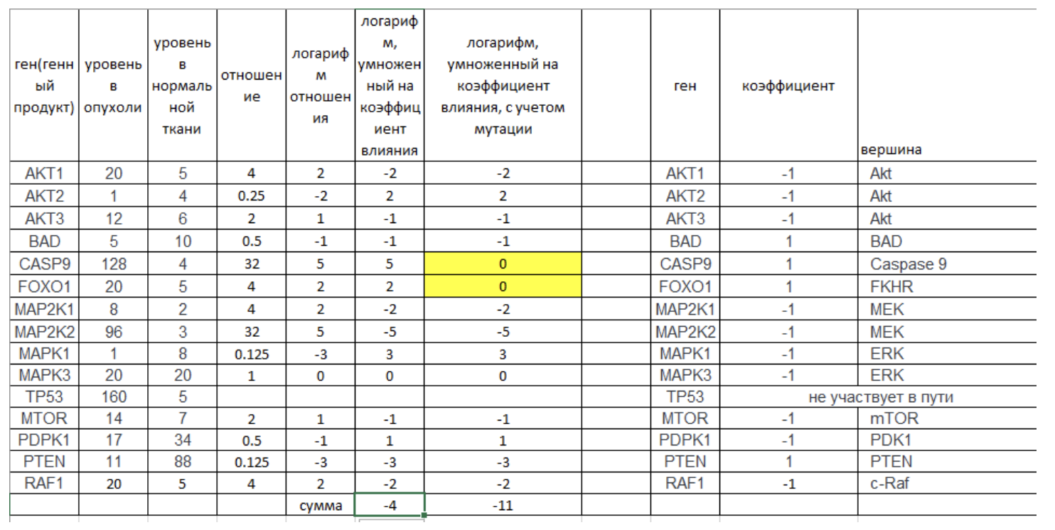 для PTEN, BAD, FKHR, Caspase 9 коэффициенты равны единице, остальные – минус единице.