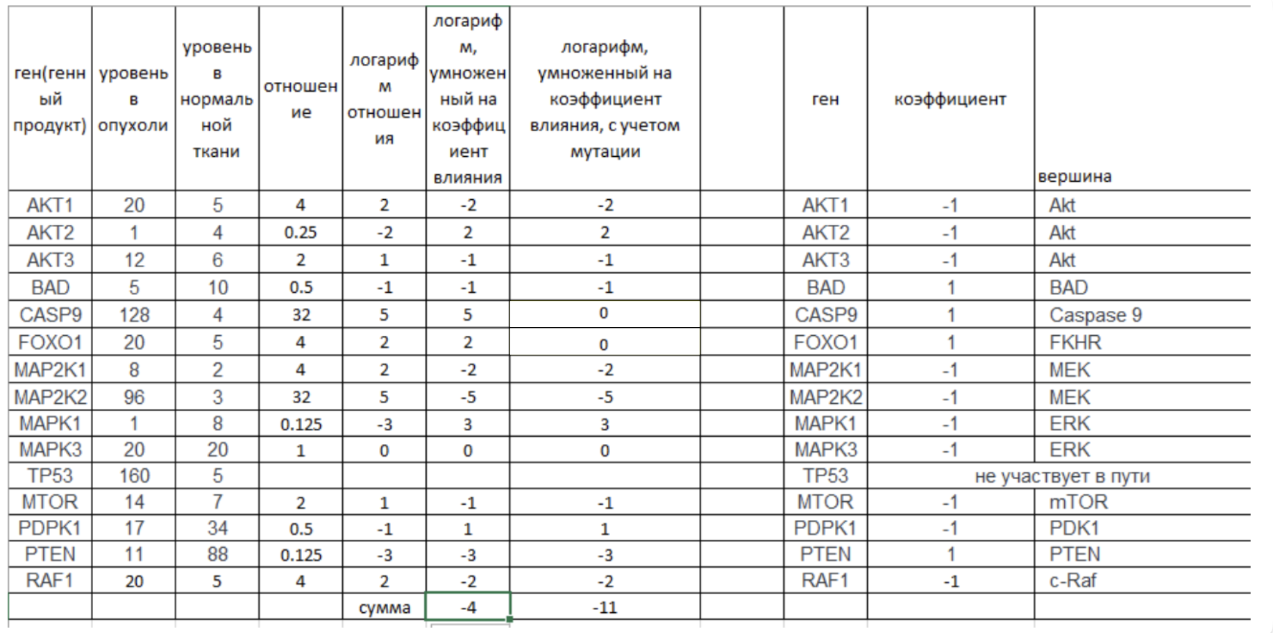 Задание 5. Рассчитайте уровень активности молекулярного пути (число) по экспрессионным данным из Таблицы 1. Также приведите для каждого гена двоичный логарифм отношения опухоль/норма.-4. (Числа простые, расчет доступен без калькулятора).